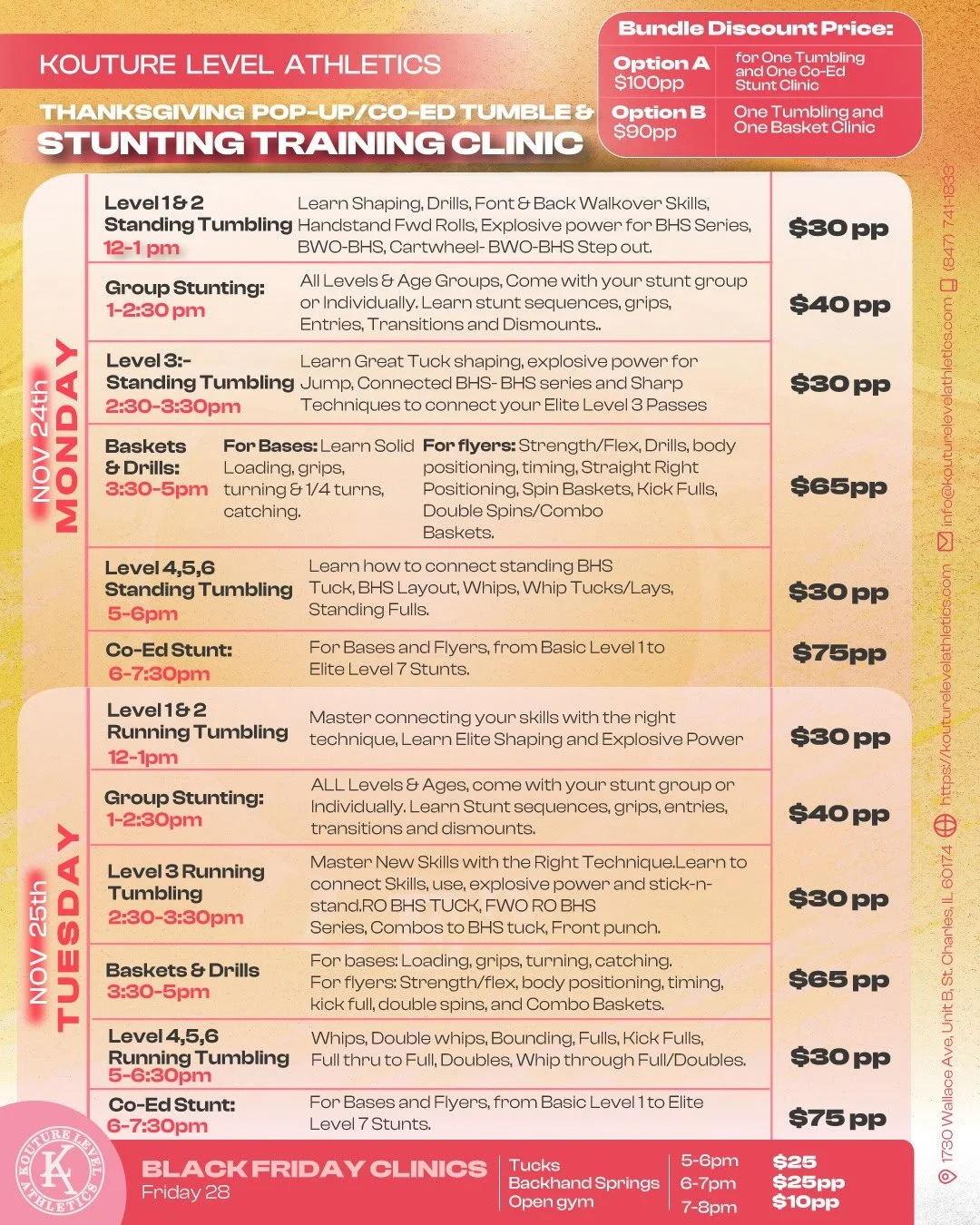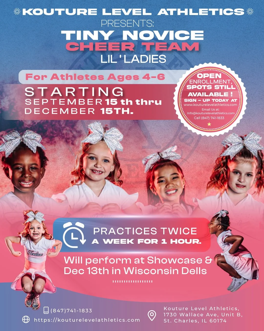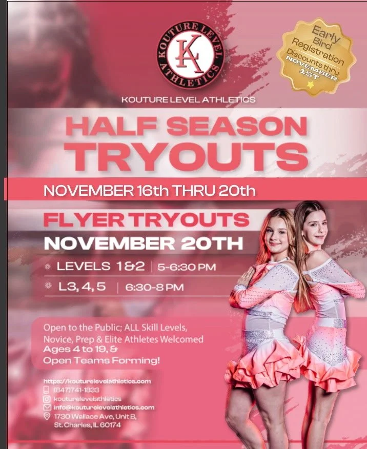 Kouture Level Athletics, located in St. Charles, Illinois, is a highly regarded All-Star Cheer Gym known for its outstanding tumbling, Cheer teams, and commitment to creating a positive environment. Our extensive selection of classes and clinics is carefully crafted to help individuals achieve their desired tumbling and stunting skills. Whether you're looking to improve your tumbling, strength, flexibility, or overall athletic abilities, our team of experienced coaches will offer unwavering support and motivation every step of the way. Elevate your cheerleading journey to unprecedented levels by becoming a part of the Kouture Level Athletics community.