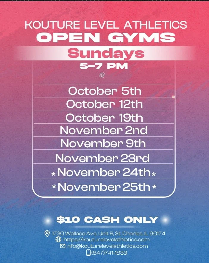 Kouture Level Athletics recently moved to our new 10,000 sq ft facility in St. Charles, Illinois. Formerly located in South Elgin, we continue to serve the Tri-City area including St. Charles, Geneva, and Batavia as well as hosting tumblers and cheerleaders from all over Kane County including Streamwood, Elgin, South Elgin, and more!